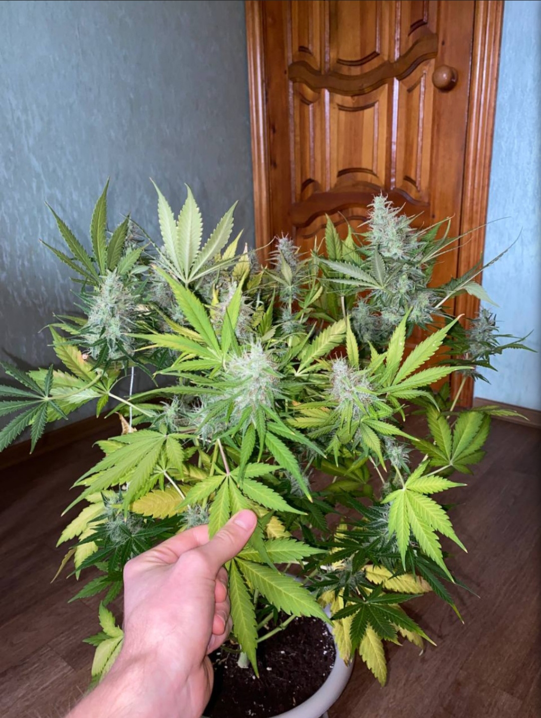 Обычный куст, вел себя хорошо, не буянил Растил под фитолампами с мощностью в сумме на 90W Земли там литров 7 Удобрял гумусом из цветочного за 150 рублей С такой мощностью ламп большего и не получится. В целом я курю часто, но понемногу. За 4 месяца употребления осталась еще половина от того что на фото. По мере роста полив дошел в итоге до 1,5 литров через день. Эта семка мне досталась вообще от друга, ей было уже года 3 к тому моменту. Я думал она не прорастет и замочил ее чисто ради интереса. В итоге пришлось снова гровить)